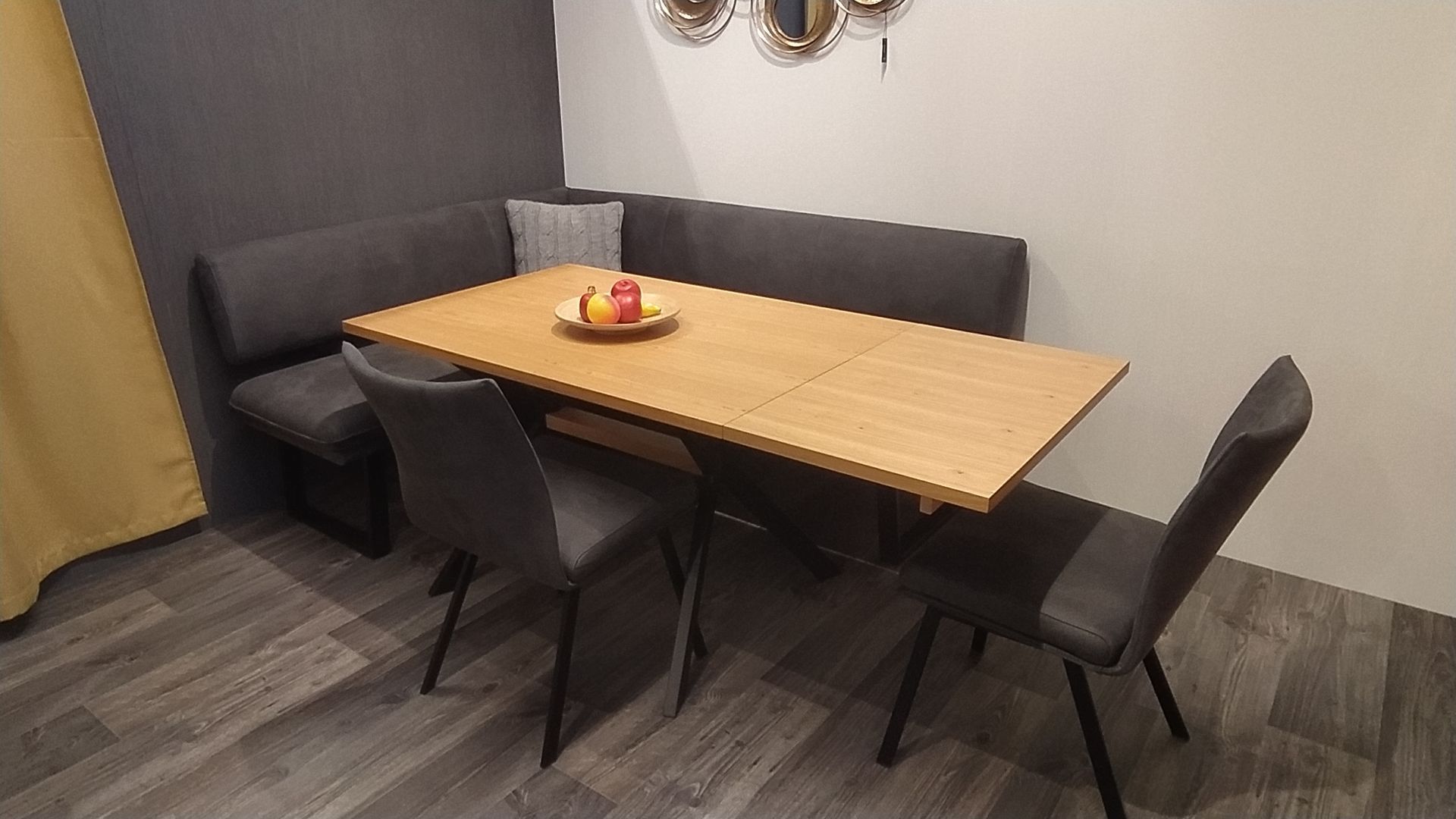 Maße ca. 152x192 cm Bezug Duncan 7105 anthrazit Holz:Wildeiche natur lackiert 4-Fußtisch 120 x 80 cm 2x Stühle Incl. Ansteckplatte